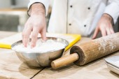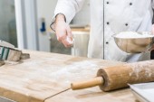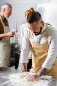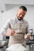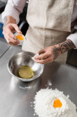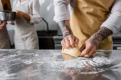 Widok wytatuowany kucharz podejmowania ciasta w pobliżu rozmytej mąki w kuchni