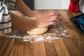 Przycięty widok szefa kuchni podejmowania ciasta w pobliżu mąki na stole w kuchni