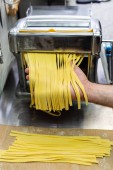 Widok na wytatuowanego kucharza robiącego spaghetti na maszynie do makaronu w kuchni, baner