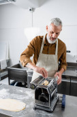 Wesoły azjatycki kucharz patrząc na surowe spaghetti w pobliżu maszyny makaron w kuchni