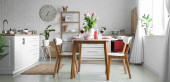 Wnętrze jasnego salonu ze stołem, krzesłami i roślinami