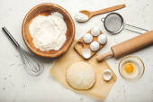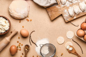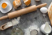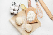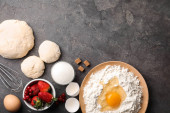 Świeże ciasto i składniki do przygotowywania domowych ciasteczek na szarym tle