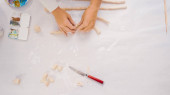 Mała dziewczynka robi glinianą płytę i dekoruje ją