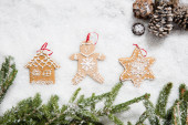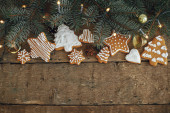 Sztandar świąteczny. Pierniki świąteczne, gałązki jodły, ciepłe światła na rustykalnym drewnianym tle, płaskie leżały z miejscem na tekst. Wesołych świąt i pór roku pozdrowienia. Obraz atmosferyczny