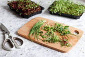 Zdjęcie "Zbieranie domowej uprawy drobnoziarnistych rzodkiewek, kiełków warzyw liściastych w talerzu i nożyczek na drewnianym tle." może być wykorzystywane do celów osobistych i komercyjnych zgodnie z warunkami zakupionej licencji Royalty-free. Obraz jest dostępny do pobrania w jakości wysokiej rozdzielczości do 5760x3840.