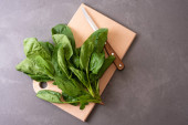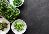Zbieranie domowej uprawy drobnoziarnistych rzodkiewek, kiełków warzyw liściastych w talerzu i nożyczek na drewnianym tle.