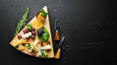 Płytka z ketogennym pokarmem dietetycznym. Wołowina, łosoś, jajko, brokuły, pomidor, orzechy, marchewka, grzyby, ogórek, daty. Dietetyczne jedzenie na ciemnym tle z przestrzenią do kopiowania. Widok góry. Układy płaskie