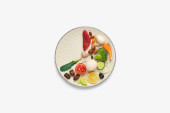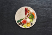 Płytka z ketogennym pokarmem dietetycznym. Wołowina, łosoś, jajko, brokuły, pomidor, orzechy, marchewka, grzyby, ogórek, daty. Dietetyczne jedzenie na ciemnym tle z przestrzenią do kopiowania. Widok góry. Układy płaskie