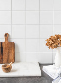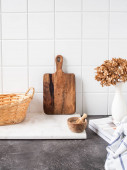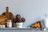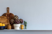 Nowoczesna kompozycja wnętrza kuchni z deską do krojenia warzyw, jedzeniem, ziołami, dodatkami kuchennymi i przestrzenią do kopiowania na półce.