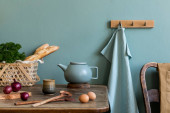 Zdjęcie "Nowoczesna kompozycja wnętrza kuchni z deską do krojenia warzyw, jedzeniem, ziołami, dodatkami kuchennymi i przestrzenią do kopiowania na półce." może być wykorzystywane do celów osobistych i komercyjnych zgodnie z warunkami zakupionej licencji Royalty-free. Obraz jest dostępny do pobrania w jakości wysokiej rozdzielczości do 5760x3840.