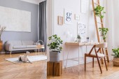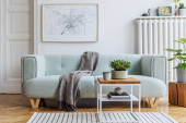 Stylowe wnętrze salonu z designerską szarą sofą, stołem do kawy, pufą, koszem, półką, lustrem, roślinami tropikalnymi, dekoracją, dywanem, poduszkami i eleganckimi akcesoriami osobistymi w nowoczesnym wystroju wnętrz.