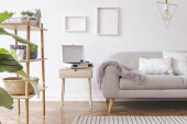 Zdjęcie "Skandynawski salon z designerską, szarą sofą, drewnianym stołem kawowym, tropikalnymi roślinami, półką, lustrem, meblami, poduszką w kratę, czajnikiem, książką i eleganckimi akcesoriami osobistymi w wystroju wnętrz." może być wykorzystywane do celów osobistych i komercyjnych zgodnie z warunkami zakupionej licencji Royalty-free. Obraz jest dostępny do pobrania w jakości wysokiej rozdzielczości do 5760x3840.