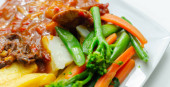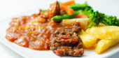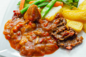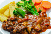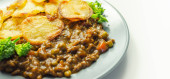 Wyciągnięta wieprzowina w sosie barbecue stylu z grilla fasoli z przyprawionymi frytkami i świeżych warzyw, amerykański posiłek