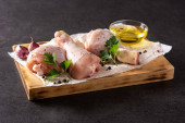 Nogi kurczaka na desce z przyprawami. Pomysł ugotowania lunchu lub śniadania w ulicznej kawiarni. Widok z góry