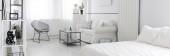 OAK PARK, IL, USA - LISTOPAD 2, 2020: Sypialnia w apartamencie na poddaszu z odsłoniętym drewnianym sufitem, szklane drzwi przesuwne do szafy, czarna ściana akcentu i luksusowe szklane światło wiszące powyżej.