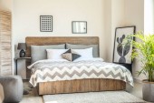 Zdjęcie "OAK PARK, IL, USA - LISTOPAD 2, 2020: Sypialnia w apartamencie na poddaszu z odsłoniętym drewnianym sufitem, szklane drzwi przesuwne do szafy, czarna ściana akcentu i luksusowe szklane światło wiszące powyżej." może być wykorzystywane do celów osobistych i komercyjnych zgodnie z warunkami zakupionej licencji Royalty-free. Obraz jest dostępny do pobrania w jakości wysokiej rozdzielczości do 5760x3840.