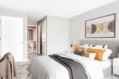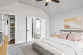 Zdjęcie "OAK PARK, IL, USA - LISTOPAD 2, 2020: Sypialnia w apartamencie na poddaszu z odsłoniętym drewnianym sufitem, szklane drzwi przesuwne do szafy, czarna ściana akcentu i luksusowe szklane światło wiszące powyżej." może być wykorzystywane do celów osobistych i komercyjnych zgodnie z warunkami zakupionej licencji Royalty-free. Obraz jest dostępny do pobrania w jakości wysokiej rozdzielczości do 5760x3840.