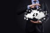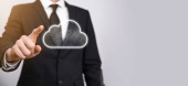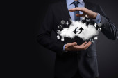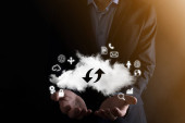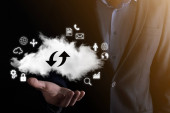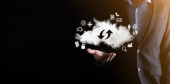 Technologia chmury. znak przechowywania chmury z dwoma strzałkami w górę iw dół po ciemku. Chmura obliczeniowa, duże centrum danych, przyszła infrastruktura, cyfrowa koncepcja ai. Wirtualny symbol hostingu.