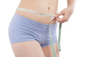 koncepcja utraty wagi. kobieta sama pomiaru. na białym tle.