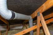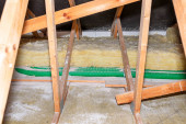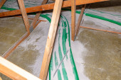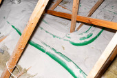 Crawl miejsca w pełni pokryte koce termoregulacyjne i dołeczki pokładzie. Rury systemu łagodzącego promieniowanie radarowe widoczne. Lokalizacja piwnic dla energooszczędnej koncepcji domu poprawy.