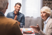 Niewyraźna pielęgniarka trzymająca herbatę w pobliżu wesołego pacjenta w domu opieki