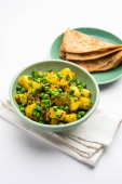 Tłuczone ziemniaki z masłem, zielonym groszkiem, cebulą, bazylią na rustykalnym drewnianym tle. Widok z bliska.