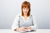atrakcyjny dziewczynka w białą bluzkę z notatnik i długopis