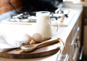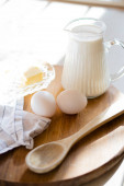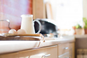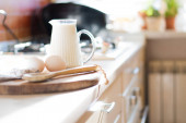Świeże mleko i jajka na drewnianej desce w prawdziwym domu kuchnia wnętrza z naturalnym światłem