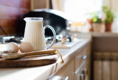 Zdjęcie "Świeże mleko i jajka na drewnianej desce w prawdziwym domu kuchnia wnętrza z naturalnym światłem" może być wykorzystywane do celów osobistych i komercyjnych zgodnie z warunkami zakupionej licencji Royalty-free. Obraz jest dostępny do pobrania w jakości wysokiej rozdzielczości do 5760x3840.