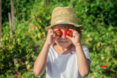 Dziecko zbiera pomidory w ogrodzie. Wybiórcze skupienie. Dzieciaku..