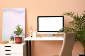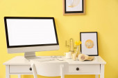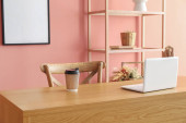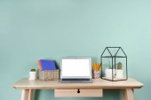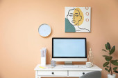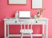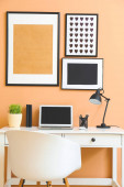 Stylowe miejsce pracy z laptopem i budzikiem w pokoju przy ścianie