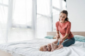 uśmiechnięta brunetka siedzi na łóżku z małym synem gryząc grzechotkę pierścień
