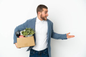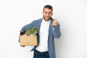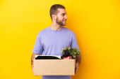 blondynka człowiek robi ruch podczas podnoszenia a pudełko pełne rzeczy odizolowanych na żółtym tle pokazując i podnosząc palec w znak z najlepszym