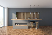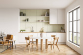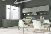 Zdjęcie "Jasnozielone wnętrze kuchni z minimalistyczną szafą modułową, trzy lampy wiszące nad drewnianym stołem jadalnym z czterema krzesłami i parkietem w stylu podłogi. Koncepcja nowoczesnego designu. 3d renderowanie" może być wykorzystywane do celów osobistych i komercyjnych zgodnie z warunkami zakupionej licencji Royalty-free. Obraz jest dostępny do pobrania w jakości wysokiej rozdzielczości do 5760x3840.