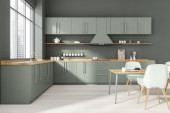 Jasnozielone wnętrze kuchni z minimalistyczną szafą modułową, trzy lampy wiszące nad drewnianym stołem jadalnym z czterema krzesłami i parkietem w stylu podłogi. Koncepcja nowoczesnego designu. 3d renderowanie