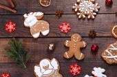 Zdjęcie "Piernikowe ciasteczka. Świąteczna kartka. Koncepcja piekarni. Tła drewniane" może być wykorzystywane do celów osobistych i komercyjnych zgodnie z warunkami zakupionej licencji Royalty-free. Obraz jest dostępny do pobrania w jakości wysokiej rozdzielczości do 5760x3840.