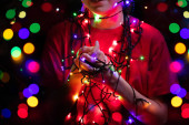 Zdjęcie "Portret uroczystej młodej kobiety z girlandą na głowie i ciele. Bokeh i światła. Dziewczyna 25 lat w kapeluszu uśmiecha się w ciemności i pokazać serce przez ręce. Skupienie selektywne." może być wykorzystywane do celów osobistych i komercyjnych zgodnie z warunkami zakupionej licencji Royalty-free. Obraz jest dostępny do pobrania w jakości wysokiej rozdzielczości do 5760x3840.