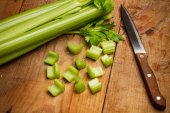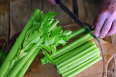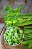 Miękkie skupienie. Seler kije na drewnianej desce. Świeże liście selera.
