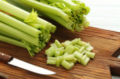 Zdjęcie "Miękkie skupienie. Seler kije na drewnianej desce. Świeże liście selera." może być wykorzystywane do celów osobistych i komercyjnych zgodnie z warunkami zakupionej licencji Royalty-free. Obraz jest dostępny do pobrania w jakości wysokiej rozdzielczości do 5760x3840.
