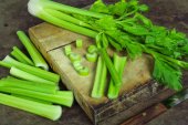 Miękkie skupienie. Seler kije na drewnianej desce. Świeże liście selera.