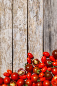 Nad głową ujęcie czerwonych, żółtych i zielonych pomidorów na rustykalnym stole z przestrzenią do kopiowania. Tło żywnościowe. Widok z góry