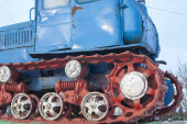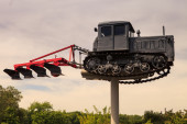 Pomnik starego rolniczego ciągnika gąsienicowego z zamontowanym pługiem na niebie nad wierzchołkami drzew