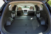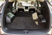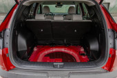 Ogromny, czysty i pusty bagażnik samochodowy we wnętrzu kompaktowego samochodu dostawczego. Widok z tyłu SUV-a z otwartym bagażnikiem