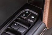 Zamknij widok okna sterującego przyciskiem w nowoczesnym wnętrzu samochodu. Detale wnętrza pojazdu. Uchwyt drzwi ze sterowaniem oknami