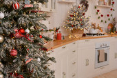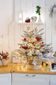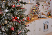 Klasyczna drewniana skrzynia z szufladami jest pięknie urządzona na Boże Narodzenie. Choinka z girlandą i dekoracjami, szyszki, świece, ozdobić klatkę piersiową szuflady w pobliżu okna.