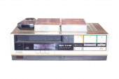 An old vintage videotape recorder from the 1980s stands on a white bedside table with a videotape.