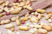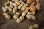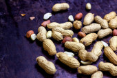 Nieobrane brązowe orzeszki ziemne na teksturowanym czarnym metalowym tle.