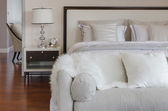 ELMHURST, IL, USA - LUTY 2, 2021: Piękna sypialnia z przytulną pościelą pod luksusowym, złotym żyrandolem z kryształami.