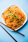 Schezwan Makaron lub Szechwan warzyw makaron Hakka lub chow mein jest popularny Indo-chińskie przepisy kulinarne, serwowane w misce lub talerz z drewnianymi pałeczkami