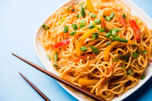 Schezwan Makaron lub Szechwan warzyw makaron Hakka lub chow mein jest popularny Indo-chińskie przepisy kulinarne, serwowane w misce lub talerz z drewnianymi pałeczkami